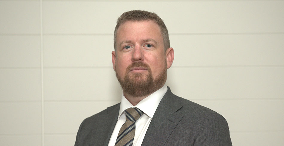 Head and shoulders shot of bearded man wearing a tie and dark grey suit