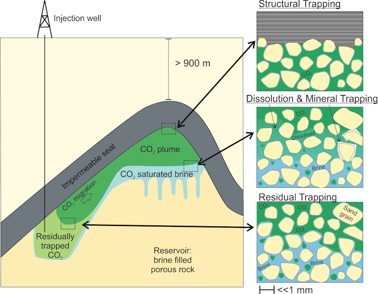 CO₂ is soluble in water, and the pore spaces of rocks underground are filled with salty water. When CO₂ is injected, it will start to dissolve in this brine almost immediately. The carbon from dissolved CO₂ will only be released if the pressure, temperature and chemical conditions in the reservoir change drastically, which is very unlikely far underground.