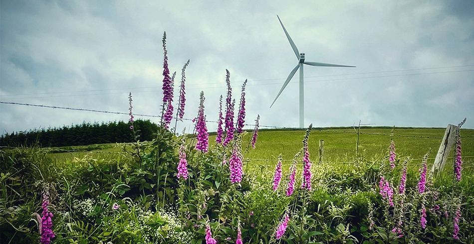 Beautiful vista of wind turbine with purple wildflowers in the foreground (galetech australia)