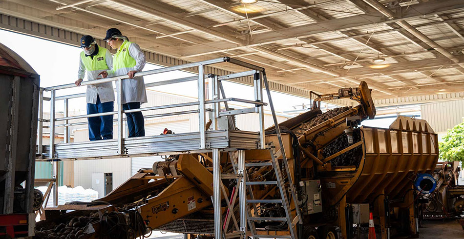 Two factory workers in hi-vis gear stand on ramp as potatoes are poured into processing machine
