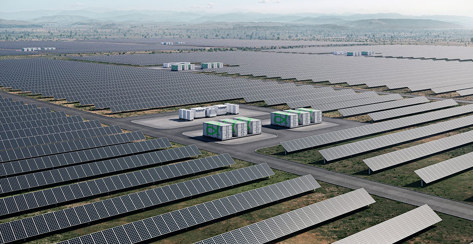 Rendered image of solar farm with battery storage units