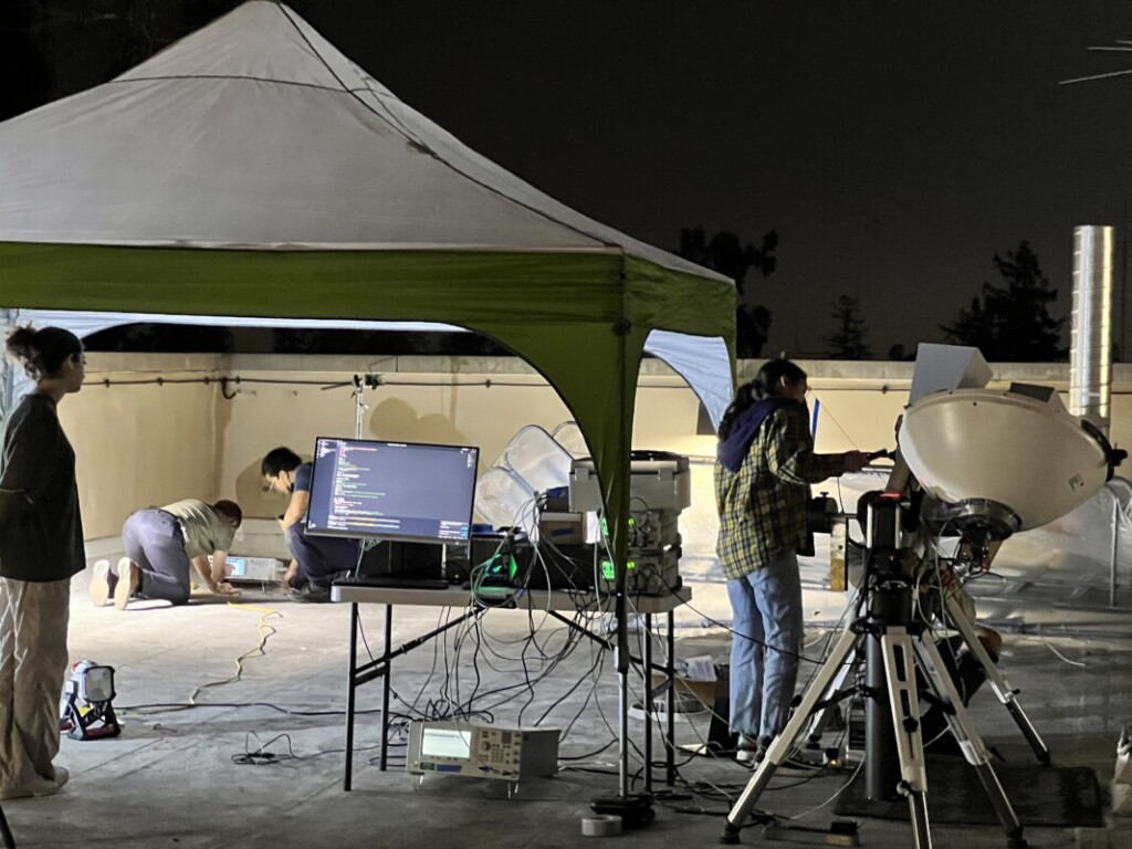 MAPLE also includes a small window through which the array can beam the energy. This transmitted energy was detected by a receiver on the roof of the Gordon and Betty Moore Laboratory of Engineering on Caltech’s campus in Pasadena. The received signal appeared at the expected time and frequency, and had the right frequency shift as predicted based on its travel from orbit.